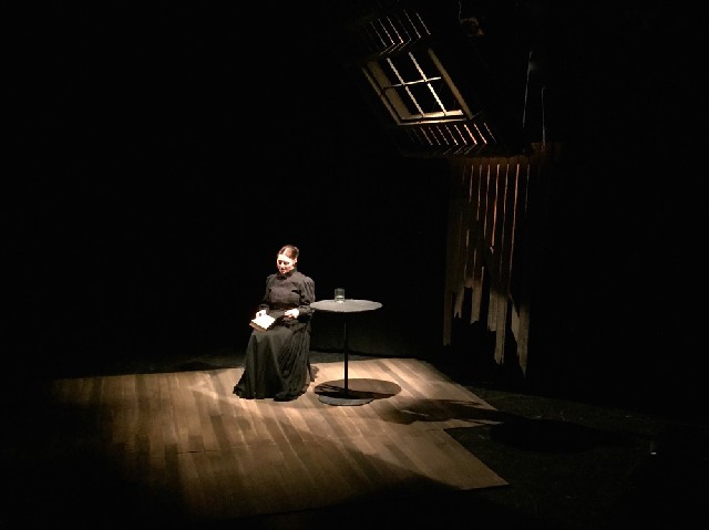 This dense drama is well paced by Hill and Scheuer as she creates a feeling of distinct scenes and mood shifts in the narrative by having her first seated and then moving about the sparse set. There is use of a glass of water to accent plot points. She walks briefly off stage returning with a gift, a bottle of vodka. This evokes her coarser side.