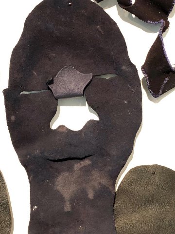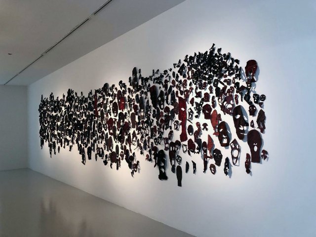 And the African American artist, Alicia Henry, who lives and teaches in Nashville, Tennessee, shows on opposite sides of a corridor huge human female figures rendered in cloth, jewelry and masks. On the second floor there are also two sizeable wall installations in a gallery made of leather cut-outs in black and brown tones. They are of human bodies, body parts, and faces. All three artists of color express differently overpowering fantasies, good and bad.