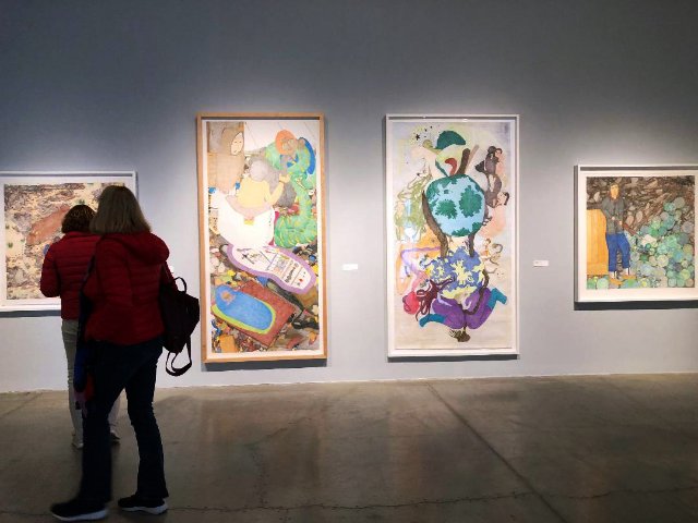 The well-known and much traveled Inuit artist, Shuviani Ashoona, depicts different fantasies of people and animals in the Artic Circle by Mapping Worlds. She also shows a series of portrait paintings in her style of rendition as outsider art.