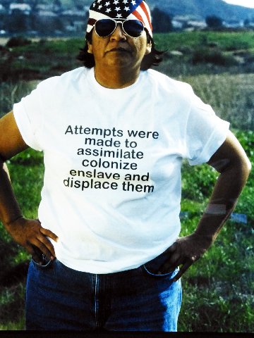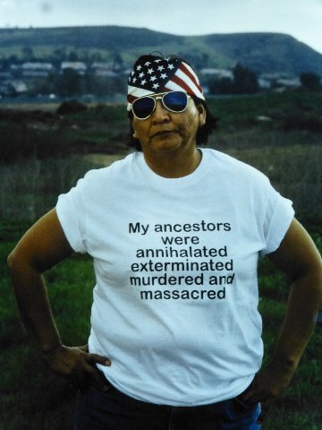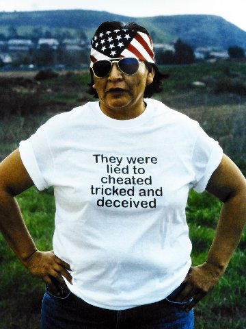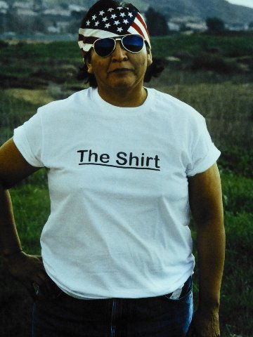 The Shirt, 2003, by Shelley Niro, depicts the artist in five photo-light-boxes wearing T-shirts with following messages: 'My ancestors were annihilated exterminated murdered and massacred'; 'attempts were made to assimilate colonize enslave and displace them'; 'and all I get is this T-shirt.' She’s wearing an American flag bandana, covering her head, and sunglasses, covering her eyes. In the end, Niro takes off shirt and shades.