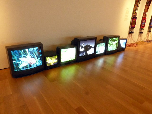 And Mike Mac Donald placed as part of the same exhibition Seven Sisters, a series of video monitors on a gallery floor. Changing photographs were taken at the Seven Sisters Maintains of Northwestern British Columbia. They are the ancestral land of the Gifxan and Tsimshian First Nations. The artist chose exquisite mountain views and plants ending with taxidermy wildlife and so projecting a message that we ‘must change our attitude to our environment and planet.’