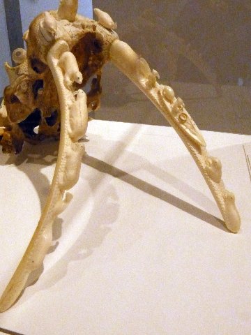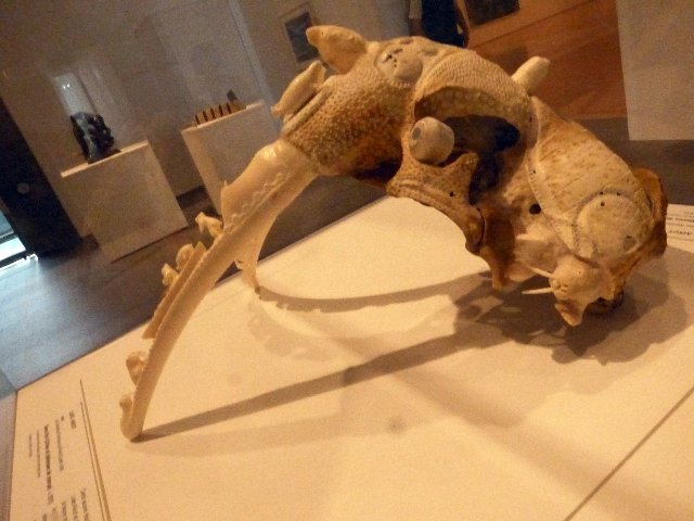 One can view works by traditional artists, such as Luke Airut, who used a walrus head with tusks and carved into the tusks arctic life details of human and animal interactions, i.e., a hunter in a kayak. Then, Jackoposie Oopakak, also Inuit, carved a set of antlers into most intricate details. Both pieces are of highest artistic quality in traditional carvings and can be viewed in the accompanying photographs.