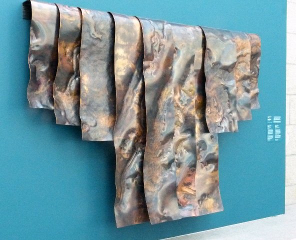 At the National Gallery in Ottawa as well as the Art Gallery of Ontario (AGO), Toronto, First Nations artist works were juxtaposed with other Canadian and international pieces, or they were shown in individual galleries. A sculpture Lost Bridal Veil, 2015 by Michael Belmore, Anishnaabe, was installed in a court-yard, in a place for contemplation. The copper and steel sculpture consisting of tall, broad metal bands of varying lengths has significant meaning for the artist. They represent pure elements in nature, both precious and utilitarian. In fact, pairing works from different centuries, similar or opposing images and messages has been practiced for a decade or more - not always successfully – in western and international museums.