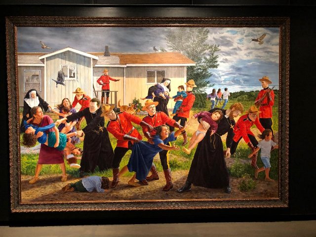 Monkman put Canada’s White Nation on trial depicting major incidents in epic paintings. He applied titles of famous international works, like The Scream by Edvard Munch and twisted the tableau. Here, the painting in near photo-realism depicts forced removal of children from their families or tribes (white terminology) by Christian monks and nuns, military and police forces. The painting’s violent crimes alert to the most penetrating inhuman sins by oppressor nations. Monkman, a Cree artist, uses direct, non-binary, sarcastic, sardonic, even humorous ways to get his messages across. Other titles of paintings regarded as European masterpieces: Death of the Virgin, The Massacre of the Innocents, The Subjugation of Truth and Le Petit dejeuner sur l’herbe have all taken on his specific messages. These paintings were finished between 2013 and 2017.