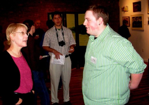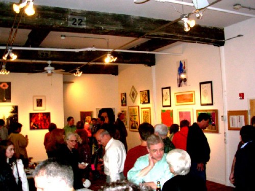 The opening of the Berkshire Salon, with some 48 artists, at the Eclipse Mill Gallery in North Adams, started at 6 pm. Within the first fifteen minutes the loft space was packed. While people came and went through the evening the party was in full swing at 8 pm when it was scheduled to be over. We doused the lights and let the cat out of the cellar at 9 pm. A hrumbling crowd didn't want to leave. They grabbed beers and headed off for after parties in several lofts from which some individuals staggered out in the wee hours of the morning. What a blast.