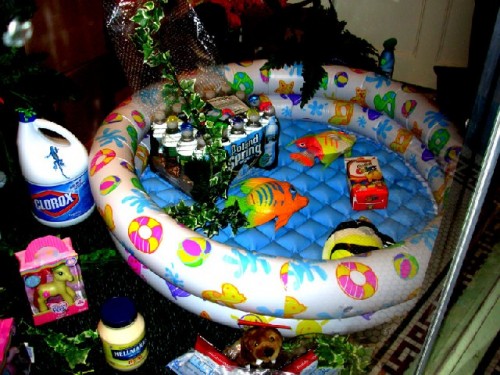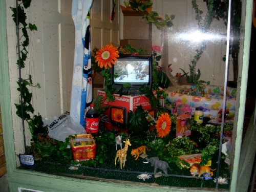 A busy week of art openings and events was marked by the conceptual "Being There" a "Geocoded" project at Greylock Arts in Adams, Mass. The show is curated by the artist/owners of the alternative space, Matt Belanger and Marianne Petit, with an assist by Richard Harrington. There is a related article on the project by Petit.The gallery always finds interesting ways to use its storefornt windows. This provides 24 hour viewing opportunities. This time Matt Belanger has created a provocative window installation composed entirely of materials purchased at the North Adams Walmart. Where he grew up in the midwest Walmart was the only act in town and had an enormous impact on his psyche.