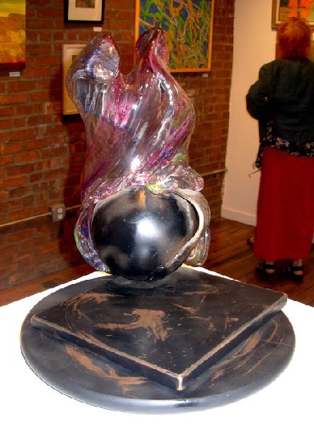 The exhibition includes a light sculpture by Julie that entails copper tubing and plumbing elements. These sculpture pieces evolved from a project for a play last fall. The project inspired her to make individual works and she showed one of the first in the Eclipse Annual last October. In fact, we bought the piece and Julie stated that it was her first sale as an artist. Now she is working hard on a new series which will be included in an exhibition she is curating for the Eclipse Gallery later this season on the theme of light as an element in art. As a part of that project the Boston artist, John Powell, intends to light the Eclipse Mill at night transforming it into a spectaculas sculpture. This is just one of several ambitious exhibitions planned for the Eclipse Gallery season which extends through the New Year.