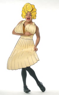The show is a series of quick, sometimes rapid vignettes of a combination of mime, drag, lipsyncing, and mimicking. By using paper and plastic and a bit of fabric that are adroitly folded and attached, Ennio is able to transform and retransform himself. His ability to use a few strong gestures to establish a known celebrity or symbolic figure is a talent that few have. He is able to capture the essence of the familiar individual in the fewest movements possible. Ennio is a bit like a caricaturist able to deftly capture a likeness in a few quick strokes of his pen. Ennio's bodyis his pen and the ink is his brilliant costumes.