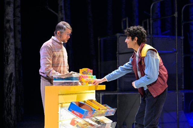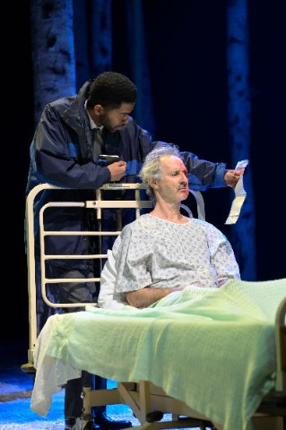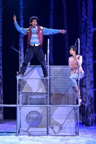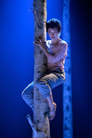A certain eeriness does derive from the staging, starting with Christine Jones’s scenic design. Although most of the action could be presented in conventional homes, schools, and hospitals, Jones’s fixed stage consists of a forest of birch tree trunks shorn of all but stubs of branches. This setting of nature’s overwhelming power induces a sense of tension and fear of the unknown crucible. Moveable props such as a bed, a couch, or a steamer trunk are brought in as needed to represent interiors, but always with the foreboding forest as a backdrop. A seeming anomaly in the forest is a large metal contraption that operates mostly like a jungle-gym for Eli but has a surprise and meaningful use near the conclusion when Oskar is trapped by bullies.