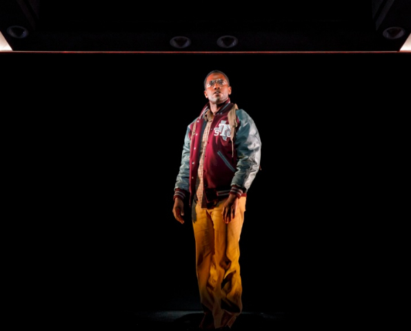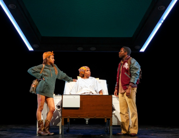 Marvelous background music from Fleetwood Mac, Sam Cook and disco fill the Ekpeyoung home in a sound design by Jeremy S. Bloom. A hovering pane of glass above the set reflects light and water. A turntable changes the scene from the Ekpeyoung’s living room to Disciple’s and then the gas station booth. Jason Sherwood created the setting.