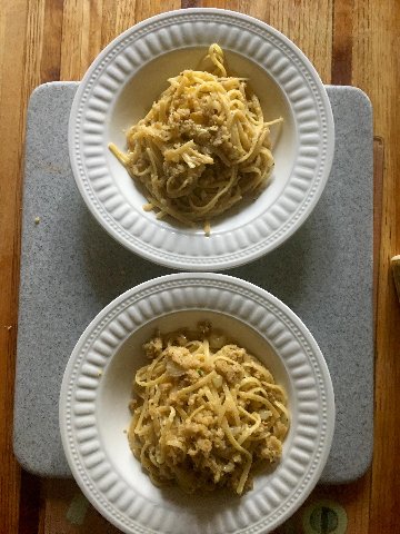 In a skillet, add olive oil and sauté chopped ramps for four minutes, add more olive oil and add panko until browned.