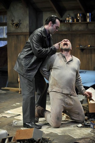 Director Eric Hill has done a masterful job of creating dramatic tension on stage out of simple pauses and dialog that is often delivered at the top of Mick's voice, or mumbled sotto voce by the stranger his brother has brought home. Along the perimeter of the stage are piles of other castoff items that Aston has rescued over the years. He collects junk and the tramp is just another item in his collection.