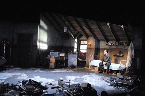 The lighting of the set, while dramatic, has problems. The sun comes in at such a unnatural low angle that the earth and intervening buildings would seem to have become transparent. Some of the fresnels and other lights needed barn doors to prevent light from washing beyond the stage.