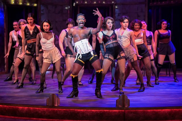 In this production, non-traditional casting employs a black man, Rotimi Agbabiaka. For those so-called traditionalists, let’s note that this depiction adds only one more layer of disbelief to suspend, and this actor nails the characterization with great confidence from the iconic opening song sequence of “Wilkommen, Bienvenue, Welcome.” Throughout, his panache exudes charisma as he struts and mugs.