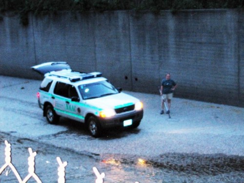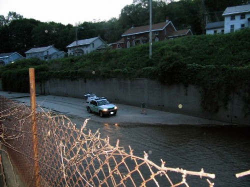 It seems that there was an access gate down stream. With a cement river bed she was able to drive the SUV close to the edge of the flow.
