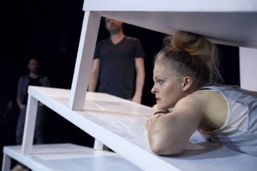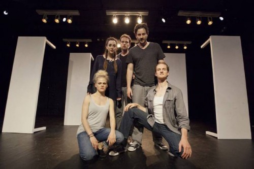 For this production the director has broken up what could have been a monologue into separate lines and distributed them somewhat equally among the 5 young and athletic actors, Estelle Bajou, Christopher Bakes, Nick Flint, Christina Bennett Lind, Richard Saudek. They traverse the stage, in their best Pilobolus fashion, carting James Hunting’s set, a long narrow tables, one for each, which serve quite nicely as a chair, a bed, and various meeting places. Outwardly, the linearly recited story is simple. Inwardly, the verbalized thoughts of each self-torturing character, one minute infused with love compassion towards ‘Miss Pool’, the next filled with malice – is anything but.