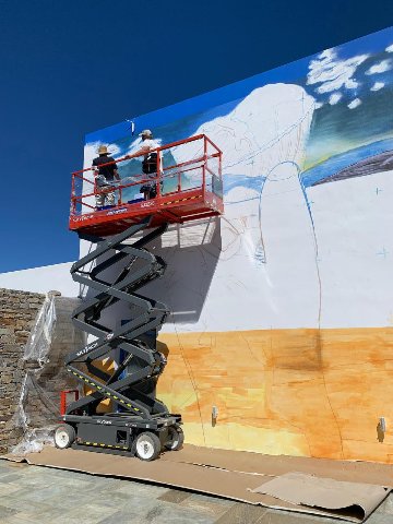 RM The wall surface was smooth concrete painted white with heavy-duty outdoor paint. The finished mural was mat-varnished with a special tough varnish against sun, salt in the air, UV rays, humidity and rain, even hail. The paint was applied with “scrub-grit” brushes, those used to clean tiled floors, one-inch and five-inch flat brushes, and acrylic spray paint in cans with adjustable nozzles.