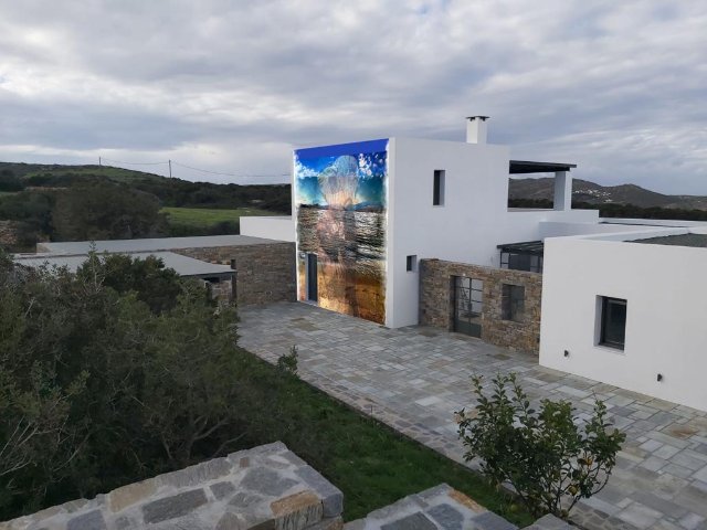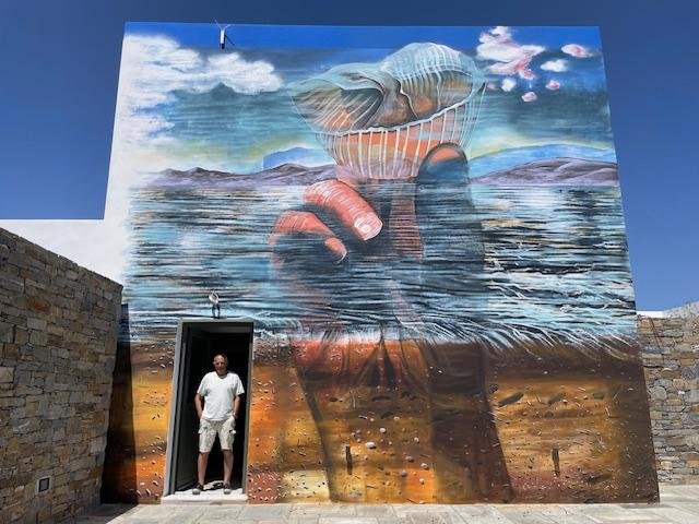 Rafael Mahdavi The wall for the mural is part of a friend’s house on the Cycladic Island of Paros. I spend my summers there. I first met Frank at my first solo painting show in NYC at the Tibor de Nagy Gallery in 1973. Frank and I stayed in touch, he liked my work. Last year he commissioned the mural. Seven by seven meters