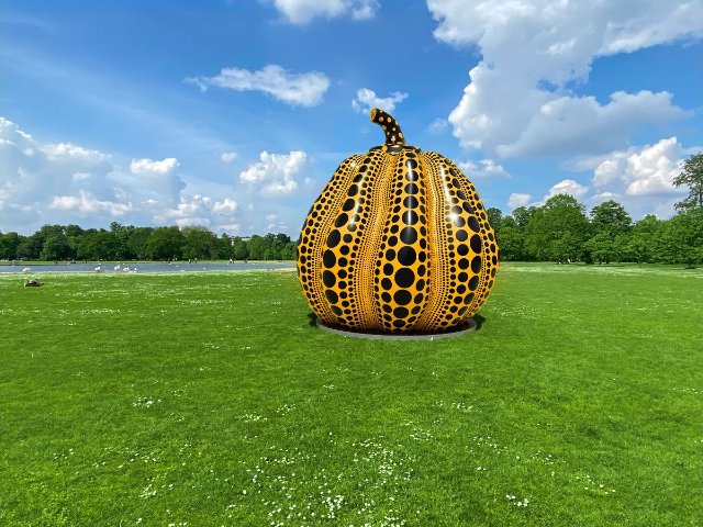 The work on view in Kensington Gardens is Kusama’s tallest bronze pumpkin sculpture to date, standing at 6 metres tall and 5.5 metres in diameter. Installed prominently by the Round Pond, Pumpkin (2024) can be seen from a wide variety of viewpoints and perspectives creating an intriguing dialogue with the surrounding environment of the Park.