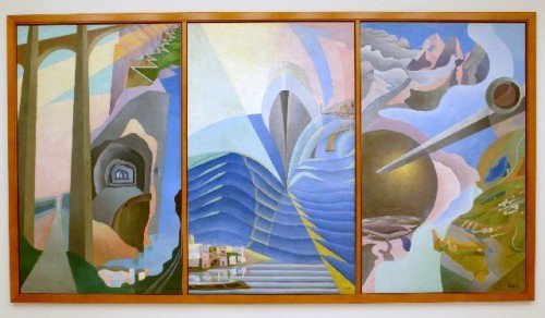 How then to explain one of the greatest surprises of the exhibition a series of large, decorative, nationalistic 1930s murals from a post office in Palermo by Marinetti’s wife Benedetta Cappa. Her work has captivated visitors to the exhibition with their scale, energy and fresh colors.