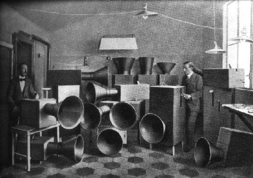 The aesthetic strategies of Marinetti and his peers, particularly Luigi Russolo’s pursuit of noise music and its apparatus, resembled the pacifist Dada artists escaping war in the infamous events of the Café Voltaire in Zurich. Not far away Lenin languished in exile until smuggled back into Russia by Germans intent on fomenting the revolution.