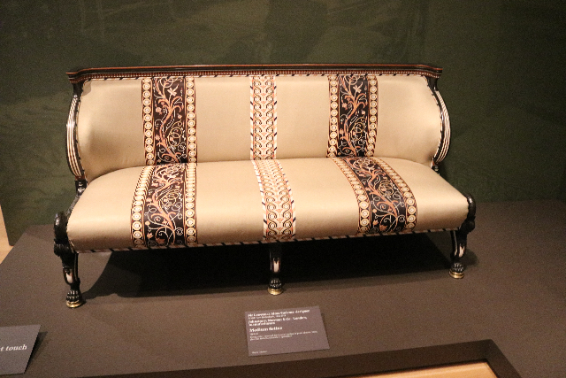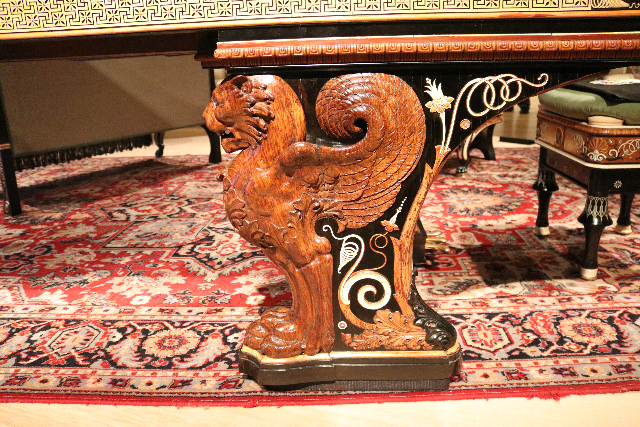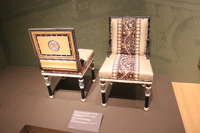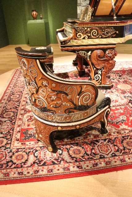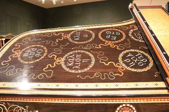 In addition to painting and sculpture Marquand was interested in antiquities. There were discoveries being made at Pompeii and Alma-Tadema was noted for meticulous travel and research. There are many such details in the furniture designed for the music room. The collector also commissioned a painting "A Reading from Homer" (1885) which hung over the settee.