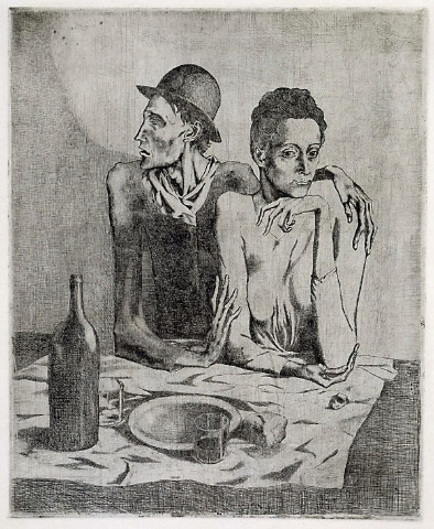 Initially, during his Blue Period as a paradigmatically starving artist, a subject in the work, prints were a means of making affordable multiples. On every level one of his first prints "Frugal Repast" from 1904 was a success. This early masterpiece is still among his most valued and sought after prints.
