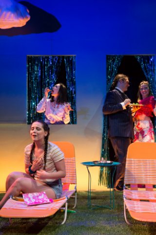 Aaron and I wrote an opera collaboratively with Matt Welch a few years ago called Sisyphus (all three of us wrote the libretto and music). Our music fits relatively well together, not that our styles are similar, but I suppose they’re similar enough. For Chunky in Heat we chose three additional composers whose work we liked. Erin Rogers’ music is probably the most different from the rest of ours. Her music is a little more in the traditional vein of avant-garde music, but that contrasted nicely with my music which is more in the style of funk or dance music, and it contrasted nicely with the Burt Bacharach style Bossa Nova piece that Aaron composed in Chunky in Heat. We had a workshop a few months ago to see if everything worked together, and people revised a little after that, but not too much. We didn’t try to coordinate tonal centers or tempos or anything like that. We wrote fairly independently, but with the mindset that all these sections would be connected. For example, for the 12th scene, I composed music that was somewhat static and minimal. I did that because it was toward the end of the opera and I assumed that by that point there would have been a lot variety, and I didn’t want the audience to get fatigued by too many different sounds, plus I thought a certain amount of motionlessness before the last two scenes would set up those two scenes to sound more dynamic and would make for a stronger ending. Finally, our conductor, David Bloom (music director) is incredibly sensitive and smart, and I think his interpretations helped glue everything together.