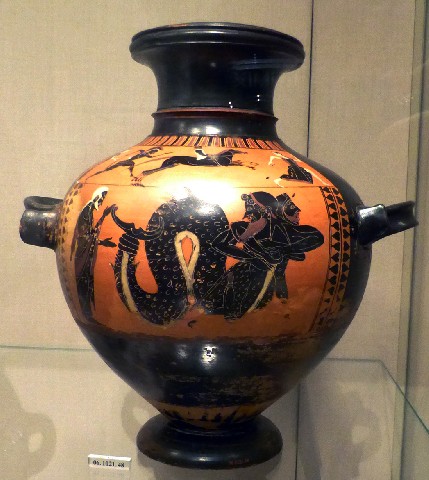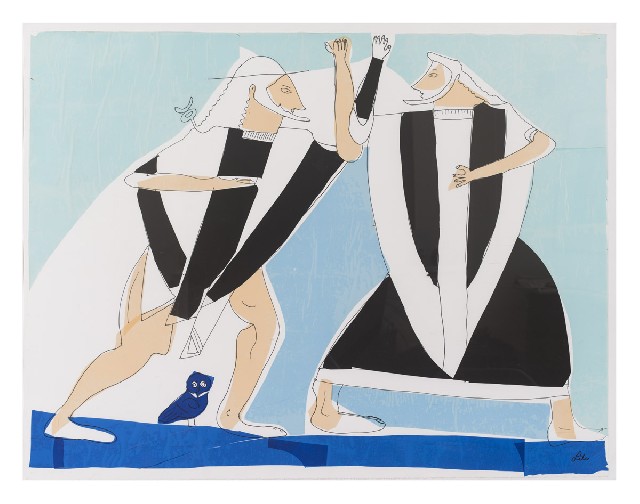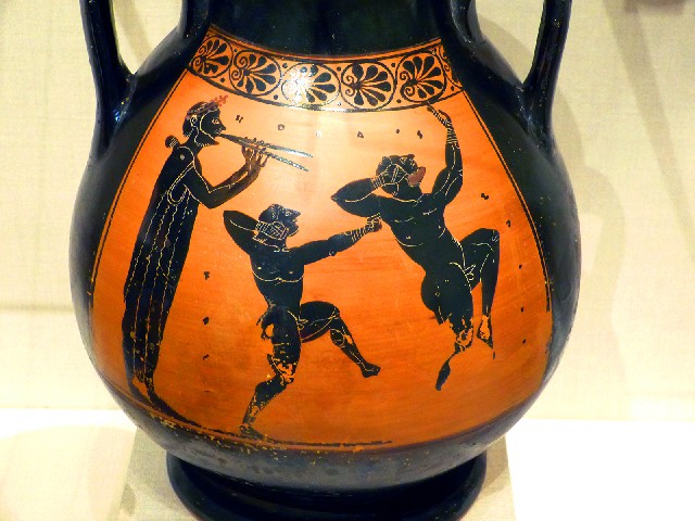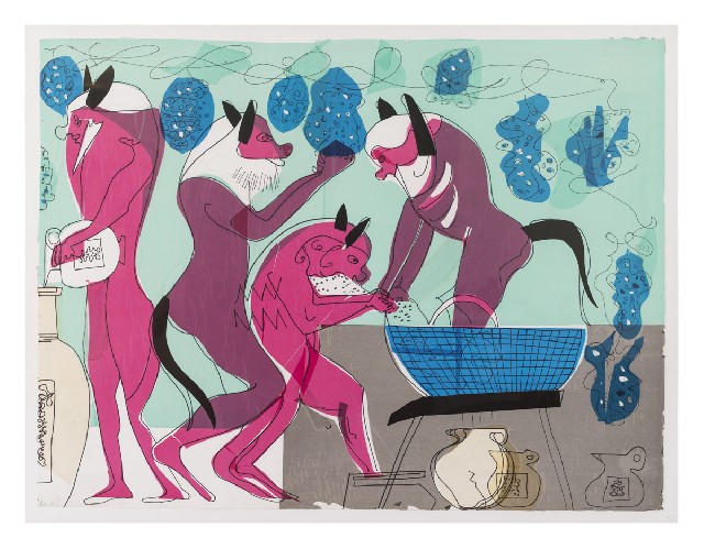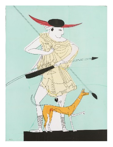 From the sketches he made on site he transformed and reconfigured the images with swift and sweeping lines. True to the red and black figure vases there is sharp contrast and a pervasive sense of flatness.