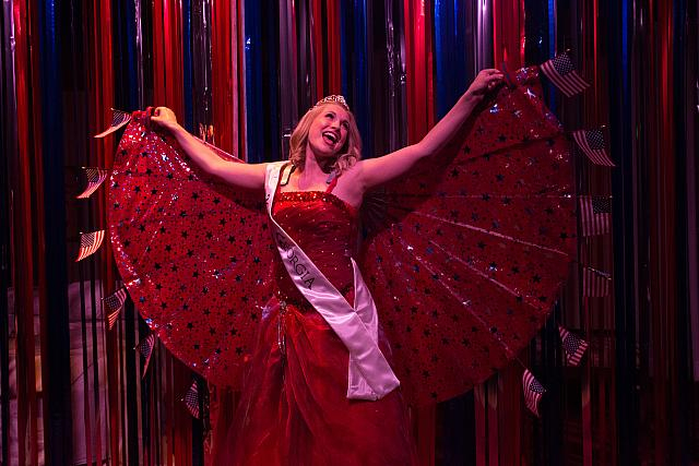 When inebriated both women admit to being so inclined but it is evident to the audience that they are a mismatch from physical to political. Gunderson has framed them in bright hues of red and blue with Miss Georgia adding the All American white.