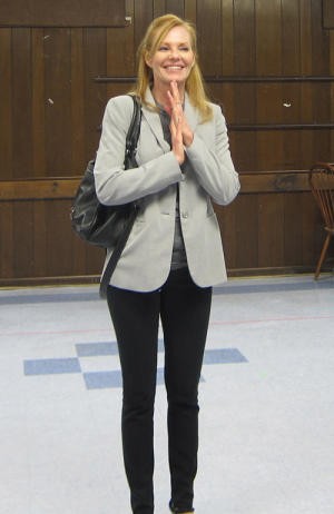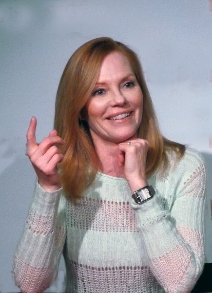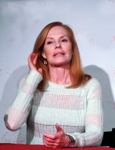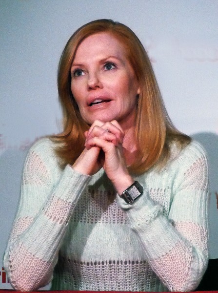 At close range we observed a rail thin, remarkably fit, middle aged woman. “I’m 53” she proclaims. Helgeberger, a tall drink of water, was poured into a form fitting, business like pants suit and unobtrusive blouse. She negotiated the evening on black spiked heels. Now and then she tossed a bouncy mane of strawberry blonde hair that looked quite natural as did her understated makeup.