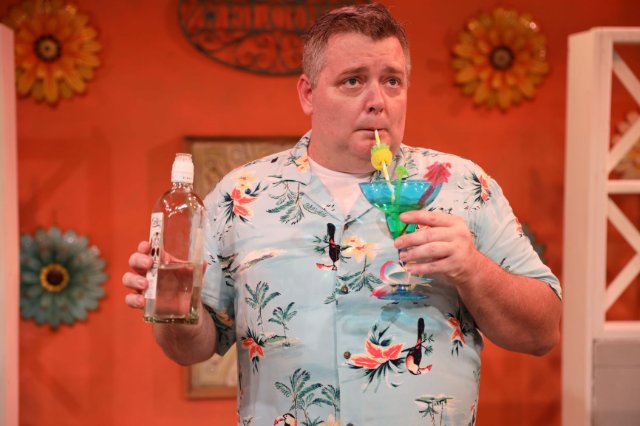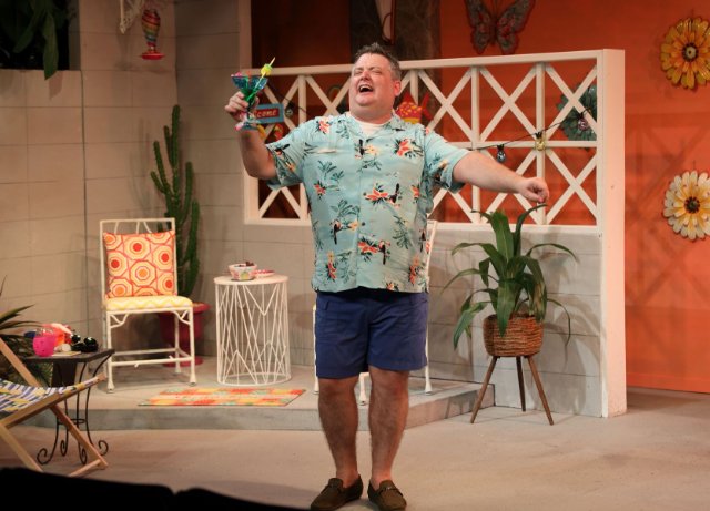 But, Bright Colors and Bold Patterns, playing at the nonprofit, professional Island City Stage near Ft. Lauderdale through June 29 in a riveting, hilarious production, does not include scenes from the wedding. Rather, Droege sets his play on a pool deck the night before Josh and Brennan are to tie the knot during a ceremony in present-day Palm Springs, Calif. Gerry is the only character physically present in the play. It is essentially a roughly 1 hour and 45-minute monologue. Still, Gerry talks to others as though they were present. Pauses in the play are stand ins for the other characters’ spoken words. Instead of having Gerry face one way while speaking as himself, and then face another way to represent another character speaking, all of which would be unoriginal and exhausting, audiences infer what the other characters might say. Also, the playwright avoids the overused device of characters speaking to the audience in one-person shows.