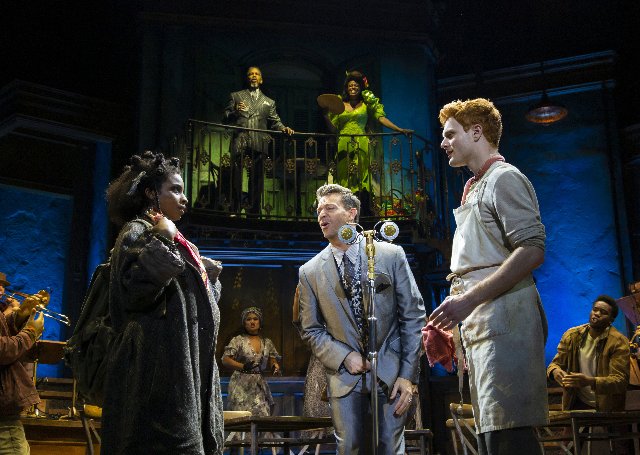 The single set has a somewhat-worn New Orleans nightclub look with wrought-iron balcony lace and plantation shutters above, plus elevated platforms on either side of the stage for the split seven-piece orchestra. Since the action takes place in other venues, the show might seem semi-staged. And since most of the principles are attired in dressy clothes, it may even look like a concert version. But the effective use of high-contrast lighting and darkness; movement; and other costumery stimulate the viewer’s imagination to fill in the blanks. One example of a symbolic look is the depiction of dreary underground laborers in dirty work clothes, trudging on a rotating stage lit only by miners’ head lights and a few dim swinging lamps.