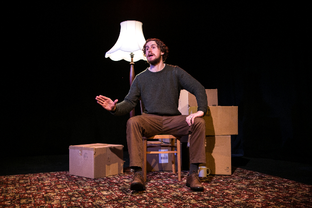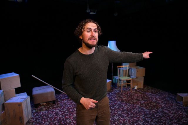 The set was as disheveled as McNair in a most appealing way. The stage was filled with brown packaging boxes of the size that would fit a small microwave. There was also a plain chair and lamp. The set looked like either a garden shed or an attic. This worked well for McNair to jump around from box-to-box and chair to floor. At one point he assumed a yoga pose. All this action occurred while reciting the monologue without missing a beat. The lamp and drum beats majestically coordinated with McNair's dialogue.