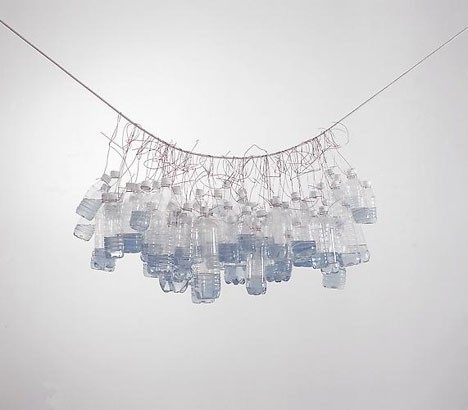 We encountered a mobile created with wire hangers into one end of which were twisted in place those small, mini serve, plastic water bottles.