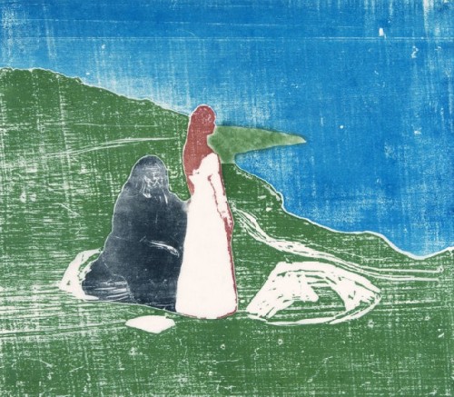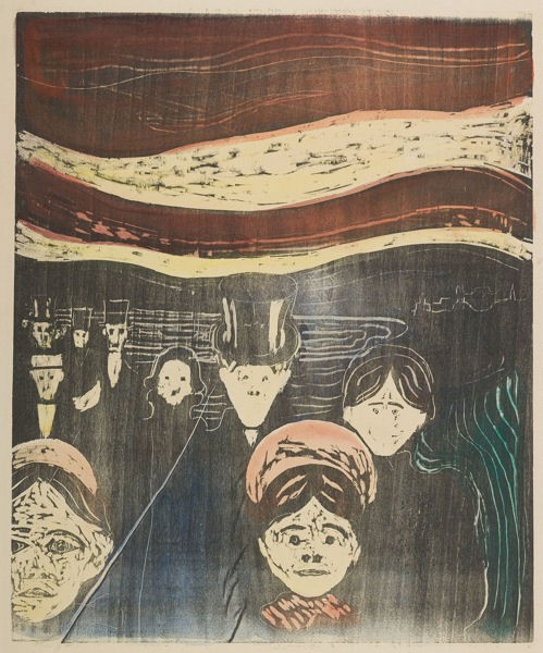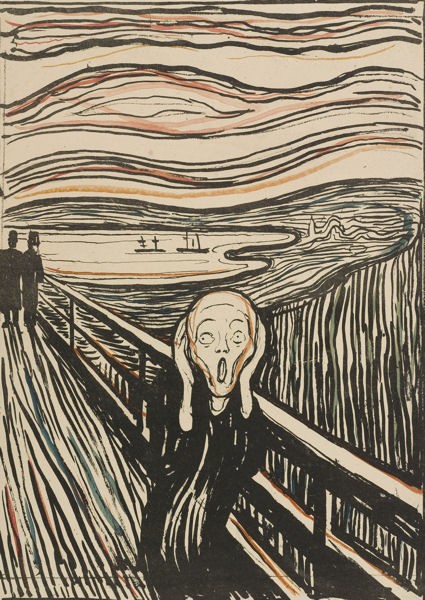 The second grouping is called Anxiety of Life and Death. A lithograph of The Sick Child, based on the death of the artist’s sister, is in this section; three different versions are shown side by side. This section also includes an iconic hand-colored version of The Scream. In a grouping entitled The Lonely Ones, the display includes three versions of Melancholy III, Moonlight, Two Women on the Shore, and The Girls on the Bridge. The final section is entitled Munch and Scotland. This is a special display focusing on the history of Munch’s first solo exhibition in the UK, which was held in Edinburgh in 1931. Munch’s influence on Scottish artists, as well as artists working across Europe, is displayed in the downstairs galleries, which includes paintings and prints by Max Beckmann, Otto Dix, Kirchner, and Kandinsky.