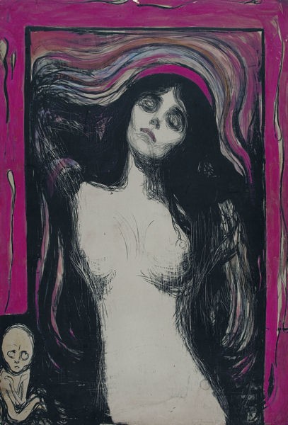 Edvard Munch: Graphic Works from the Gundersen Collection is a special exhibition requiring an admission fee (7 Scottish pounds). Featuring 60 master works on paper by the celebrated Norwegian artist, the lithographs and woodcuts, primarily dating from 1895 to 1902, include many of the motifs that Munch grouped into a series entitled “The Frieze of Life,” which focused on universal concerns of love, anxiety, and death. The prints are grouped under different headings. A section entitled The Modern Life of the Soul includes Self-portrait with Skeleton Arm, Woman with Red Hair and Green Eyes, and Madonna. Different versions of the subjects alongside each other show how Munch used color, both added by hand and in the printing process, to emphasize the drama of his image. A lithograph of Madonna is one example.