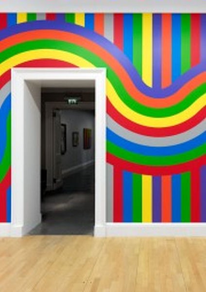 American Minimalist artist Sol LeWitt’s Wall Drawing #1136 (2004) covers three walls of a room and reaches 22 meters in length. The work, which took a team of eight people a month to complete, is a vibrant world comprising 149 vertical bands hand-painted in an irregular sequence of primary and secondary colors and intersected by a sweeping curved form which snakes around the room.