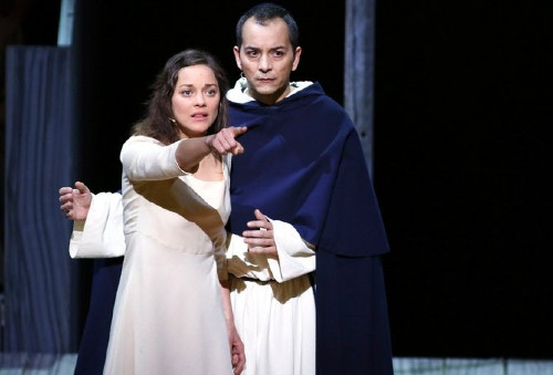 Marion Cotilliard was magnificently plain as Joan. She torched our evening. From a timid girl, fearful of being burned alive, to a human being full of love and joy, Cotilliard moves perfectly with the music and the mood. Spontaneous, dramatic, profoundly emotional, and deeply-rooted in religious conviction, Cotilliard persuades us of the saint that Joan was. Her military feats are stripped away. Except for a brief story about her sword, we are dealing here with a very young penitent. She is in violent self-control.