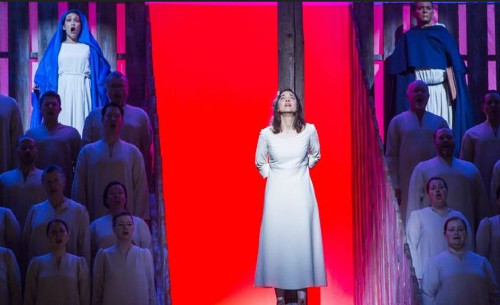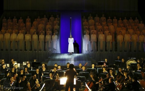 The orchestra was submerged in the front of the hall. Action took place on raised ramps and a stage surrounding them. The chorus, standing both for Joan’s detractors and also her supporters, were mounted on two grandstands which framed the stake. Between the grandstands, an open sliver represented a pathway to earthly matters and also to heavenly ones. Pools of white and blue and blood red light bathed the sliver to reflect the emotion of the moment.