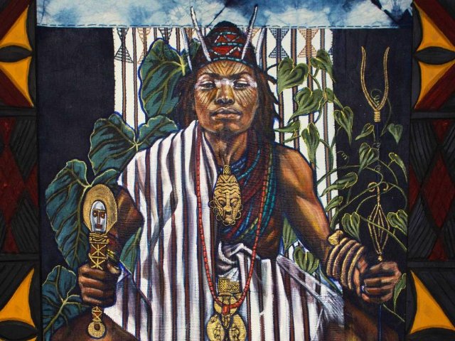 Several of the contemporary works on view in the exhibition were acquired in 2020, as part of an MFA initiative to support living artists in Boston and nationwide during the COVID-19 pandemic. Among these new acquisitions is Joseph Lewis as Eze Nri (2018) by Stephen Hamilton (born 1988), a local artist and educator who learned traditional dyeing and weaving techniques from master weavers in Nigeria. In a meditation on ancestral heritage, the portrait—part of the series The Founders Project, which reimagines Boston Public Schools students as the legendary founders of the West and West-Central African ethnic groups—is displayed in the exhibition alongside a woman’s elejo wrapper cloth (1900–50) from Nigeria and a 1975 quilt pieced together from corduroy pillow covers by iconoclastic quilter Annie Mae Young (1928–2013) in Gee’s Bend, Alabama.