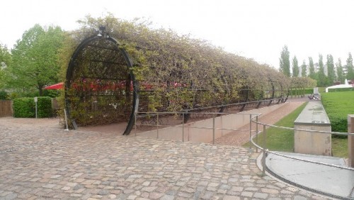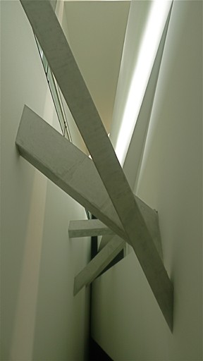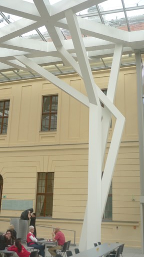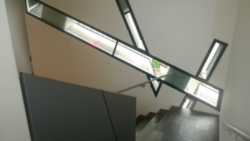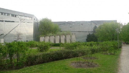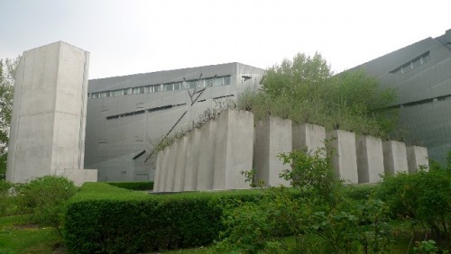 Libeskind's building is entered below ground from the older structure. There are three intersecting paths. The architect designated the first one as an "axis of historical continuity." The second path leads into the E.T.A. Hoffmann Garden with its slanting pillars that are symbolically denoting exile. The third comes to a deadend inside a bare concrete tower with no exit.