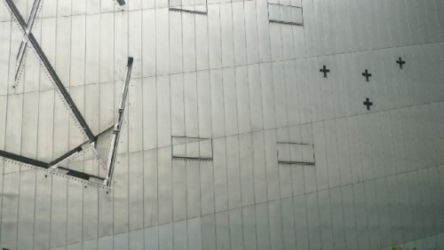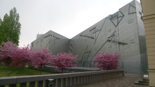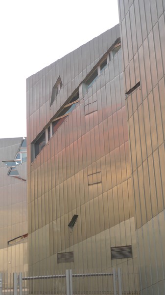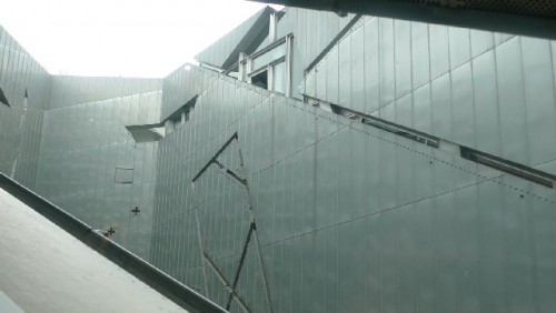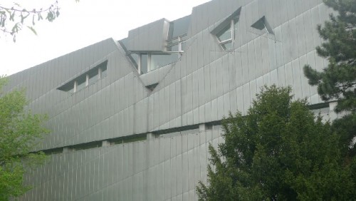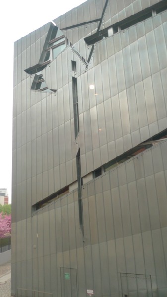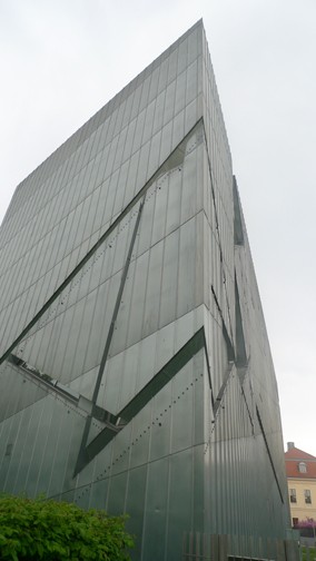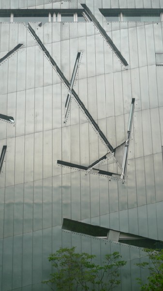 Architect Libeskind's design was quite startling. He set his irregular zigzag building next to the former appeals court building in complete contrast to the existing structure. The designer created a monolithic structure clad in zinc sheeting. The structure's shining silver facade will eventually patinate over time. Its slit windows are designed to suggest scratches, wounds and scars. Included in the four stories are three for exhibition and one for administration.