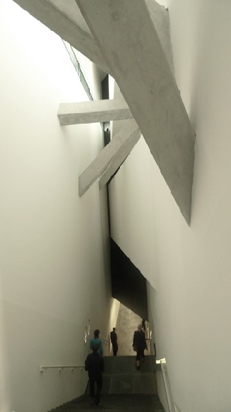 And Libeskind justified the void by relating it to a specific historic event. The architect described four factors contributing to the design of this structure. The first was linking between Jewish tradition and German culture. This concept produced the deconstructed Star of David which gave the literal alignment of the building. The second element, and one rather difficult to actually understand, was that Libeskind tried to complete, using architecture as a medium, the incomplete opera by Arnold Schonberg, "Moses and Aron." The opera ends with the phrase, "Oh word, thou word that eludes me."