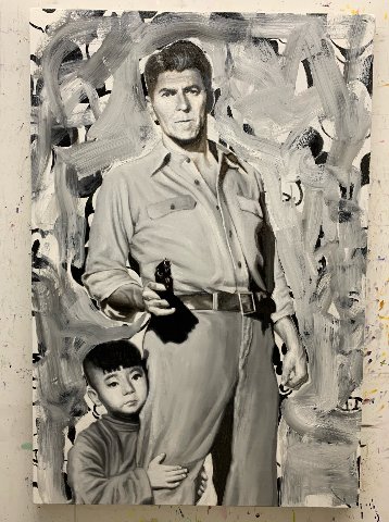 A knockout is a vertical, standing Ronald Reagan with an Asian boy clinging to his leg. Instead of a patterned overlay this time he scumbled an abstract expressionist swirl behind the movie star President. That, and the monochrome rendering emulating a faded photograph, fix the image in the post war era when America won the battle of global, avant-garde art.