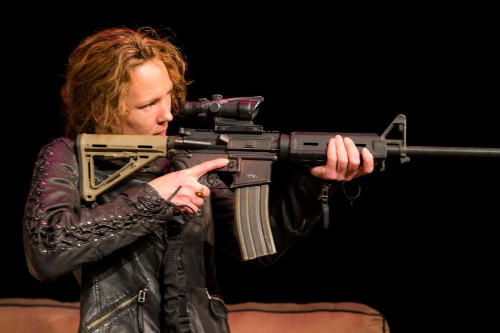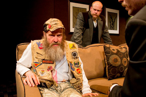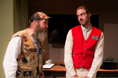 In a nice ploy, the play which takes place in an appropriately seedy hotel suite in Nashville, complete with a much used living room bar and a bath and bedroom offstage to the right – set by David Harwell – starts before the play actually starts, with a TV featuring film clips of cowboy gunslingers, killing each other, one after another.