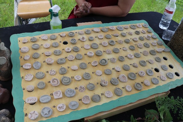 We wandered about noting the many activities. Rolling small balls of clay kids were pressing them into the rough bark of the wishing tree. There was a variety of hand made stamps to press into them. These icons evoked a vast range of magical spells.