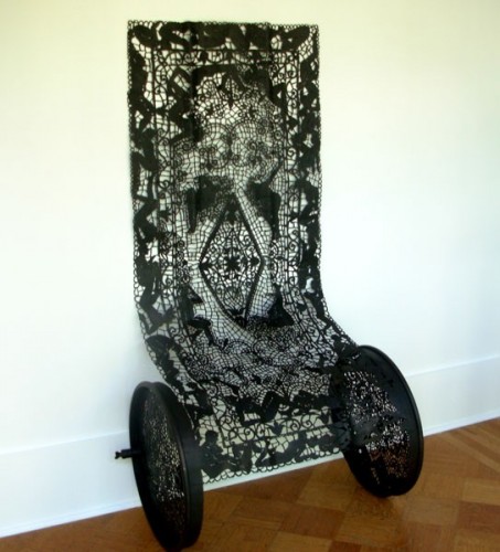 While Rotenberg Gallery rents space which is owned by the family. Several years ago, the gallery was taken over by Rotenberg's daughter, Abigail Ross. Gradually, Rotenberg Gallery developed an ever more progressive stable. With director, Kristen Dodge, the gallery has recruited artists who have attracted serious curatorial attention. Currently, the gallery is presenting its first show by Cal Lane. They discovered Lane, who cuts lace like patterns into metal objects such as shovels, wheel barrows, and oil drums, while visiting a New York art fair. Rotenberg artists have been featured at Mass MoCA and the Whitney Museum.