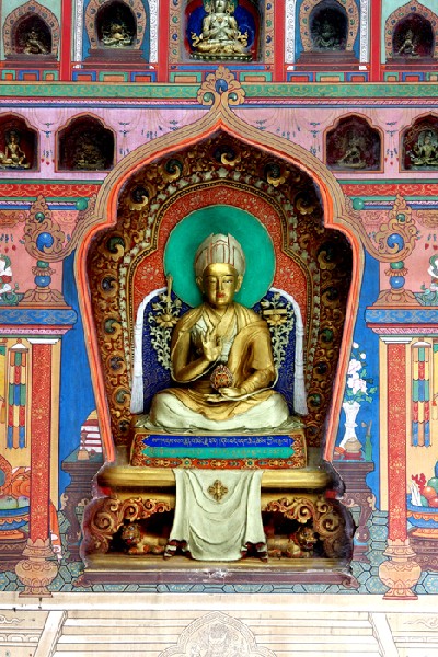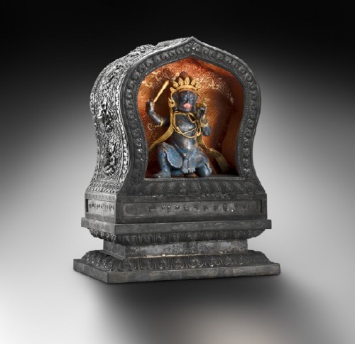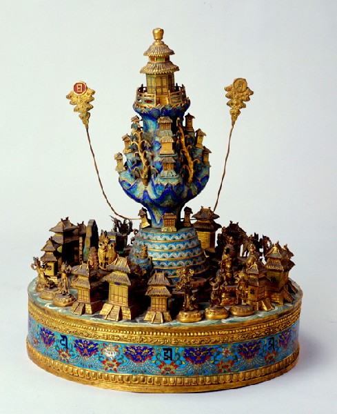 A spectacular hanging Buddhist shrine painted on silk (shown above) evokes a paradisiacal realm, radiant with color and glittering with gold. The work is a mandala, a Buddhist cosmogram depicting a portion of the universe with deities and other supernatural beings arranged in a ritually auspicious design that can aid the meditation of initiated worshippers. In an innovative combination of two and three-dimensional formats, painted figures sit nestled in glass-covered insets, dotting the piece like set gemstones. The emperor, a devotee of a form of Buddhism practiced in Tibet and Mongolia, is depicted in gold as the Bodhisattva Manjusri at the center.