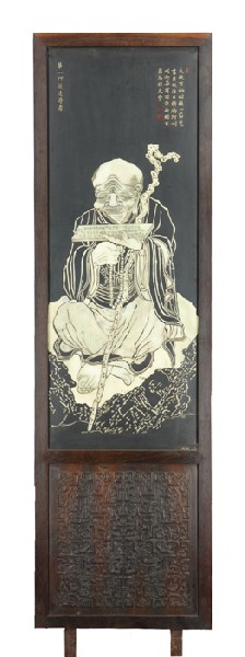 An impressive sight for Buddhist devotees or art connoisseurs is the monumental jade-and- lacquer screen (shown left) of 16 luohan, or enlightened beings –– the celebrated, quasi-legendary disciples of the Buddha. Each character is depicted in a surprisingly grotesque manner after an earlier painting by a master who saw them appear this way in a dream. Visually arresting in black and white, the reverse side of the screen is equally striking, with glorious botanical images painted in gold. Long hidden from view due to its orientation flush with a chamber wall, the reverse images were a great discovery for Palace Museum and WMF conservators working on the project.